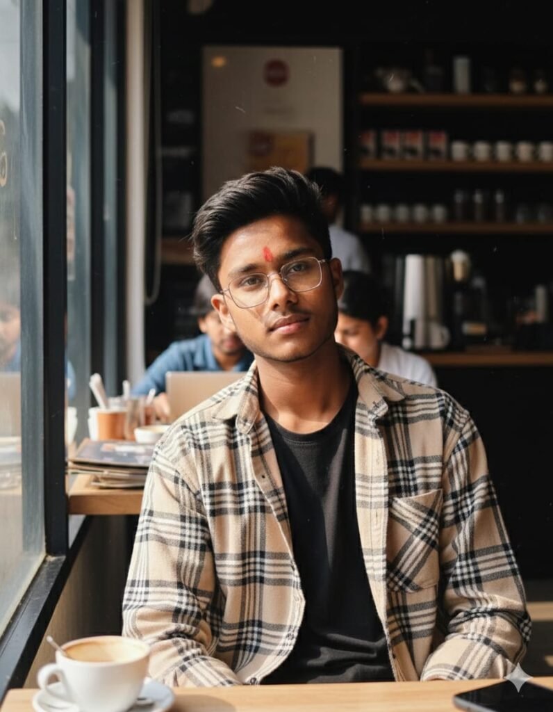 Ultra-realistic candid smartphone portrait with exact facial identity preserved from the reference image. A raw, unposed iPhone 15 photo of the young man, maintaining 100% identical facial structure, proportions, hairstyle, glasses, and expression as shown in the reference, with no stylization or alteration. He is sitting in a cozy café during natural morning sunlight, creating soft highlights and realistic shadows on his skin. The image has subtle motion blur, visible film grain, and an authentic, unedited 2026 street-style aesthetic. He is wearing a stylish, contemporary outfit, and the background features messy, real café elements such as coffee cups, textured tables, and blurred people in motion. Realistic skin texture, natural imperfections, and true-to-life color tones, captured as a candid smartphone photograph in a 3:4 aspect ratio.